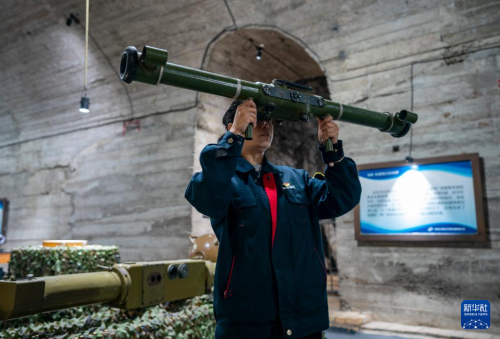 5月16日,一名工作人員在中國光學(xué)歷史博物館內(nèi)展示對空測距機(jī)使用方法。