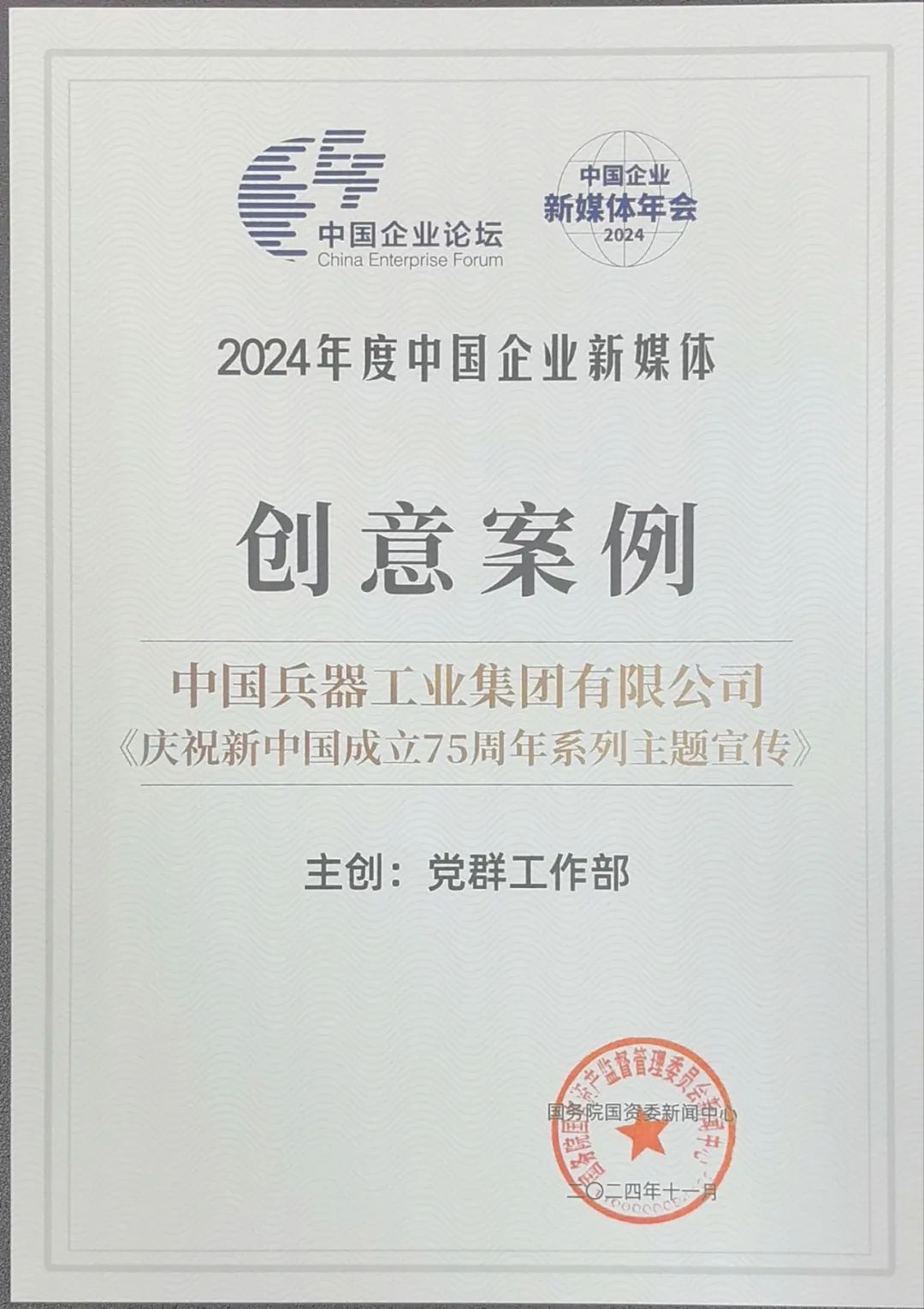 中國企業新媒體年會現場發布了“2024年度中國企業新媒體創新獎、創意獎、創作獎”,其中,集團公司《慶祝新中國成立75周年系列主題宣傳》榮獲2024年度中國企業新媒體創意案例。