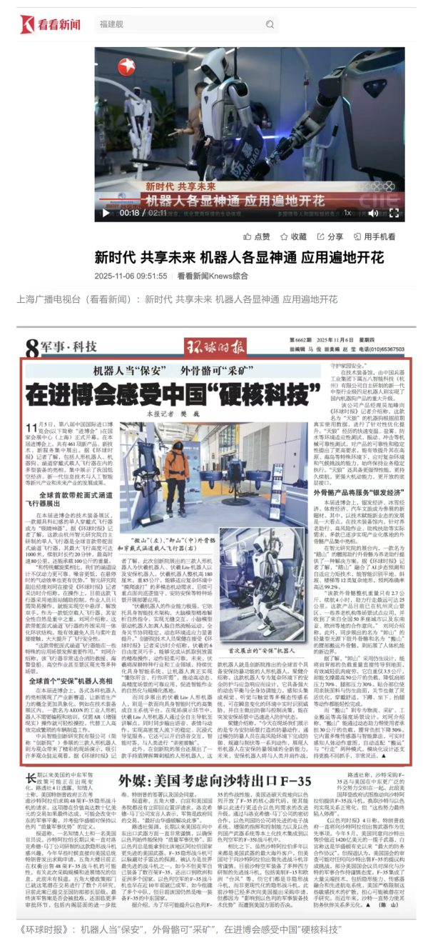 11月5日至10日,中國兵器工業(yè)集團(tuán)有限公司組團(tuán)參加第八屆中國國際進(jìn)口博覽會(huì)。集團(tuán)公司以“堅(jiān)持合作共贏,推進(jìn)高水平對外開放,助力構(gòu)建新發(fā)展格局”為目標(biāo),圍繞“新征程,共創(chuàng)未來”主題組團(tuán)參展,集中展示了一系列新技術(shù)、新理念、新成果,取得豐碩成果,受到廣泛關(guān)注。 嘉賓云集 本屆進(jìn)博會(huì)上,蒙古國駐華大使、贊比亞礦業(yè)和礦產(chǎn)開發(fā)部常任秘書、津巴布韋首席司長等多國政要蒞臨集團(tuán)公司組展展區(qū),了解有關(guān)項(xiàng)目情況。 國家能源集團(tuán)、東風(fēng)汽車、哈電集團(tuán)、鞍鋼集團(tuán)、中鋁集團(tuán)、通用技術(shù)集團(tuán)、中國中車、中國長安汽車、中國電建等央企領(lǐng)導(dǎo),工信部、國務(wù)院國資委、中國貿(mào)促會(huì)、陜西省、上海市、浙江省等國內(nèi)政府部門領(lǐng)導(dǎo)以及國內(nèi)外合作伙伴蒞臨集團(tuán)公司組展展區(qū)參觀指導(dǎo)。對集團(tuán)公司高質(zhì)量共建“一帶一路”,與各國合作伙伴共享發(fā)展機(jī)遇、實(shí)現(xiàn)互利共贏給予高度評價(jià)。 媒體關(guān)注 集團(tuán)公司集中簽約亮相央視綜合頻道《新聞聯(lián)播》、央視新聞?lì)l道《朝聞天下》《新聞30分》《共同關(guān)注》、央視財(cái)經(jīng)頻道《正點(diǎn)財(cái)經(jīng)》《經(jīng)濟(jì)信息聯(lián)播》。 《環(huán)球時(shí)報(bào)》、環(huán)球網(wǎng)、《新京報(bào)》、《中國旅游報(bào)》等對集團(tuán)公司人形機(jī)器人、四足機(jī)器人、涵道穿戴式載人飛行器、外骨骼等多型新域新質(zhì)產(chǎn)品,集中亮相進(jìn)行報(bào)道。新華社、央廣中國之聲、新京報(bào)(貝殼財(cái)經(jīng))、上海廣播電視臺等媒體直播探館,打卡兵器“硬核科技”。 人民日報(bào)客戶端、新華社客戶端、人民網(wǎng)、中國網(wǎng)、中國日報(bào)網(wǎng)、國務(wù)院國資委網(wǎng)站、國資小新微信公眾號、國資小新Facebook、學(xué)習(xí)強(qiáng)國中央企業(yè)學(xué)習(xí)平臺、經(jīng)濟(jì)觀察網(wǎng)、新京報(bào)客戶端等第一時(shí)間刊發(fā)集團(tuán)公司組展簽約、ESG建設(shè)等情況。新浪財(cái)經(jīng)、界面新聞等商業(yè)平臺閱讀量累計(jì)超500萬次。 在微博、抖音等新媒體平臺上,集團(tuán)公司高科技產(chǎn)品演示、5D穹幕電影體驗(yàn)等短視頻持續(xù)引爆流量,累計(jì)播放量超800萬次,點(diǎn)贊量破50萬。“兵器工業(yè)集團(tuán)進(jìn)博會(huì)簽約386億”相關(guān)話題登上微博熱搜榜,閱讀量破5000萬次。 文字丨劉暢 |