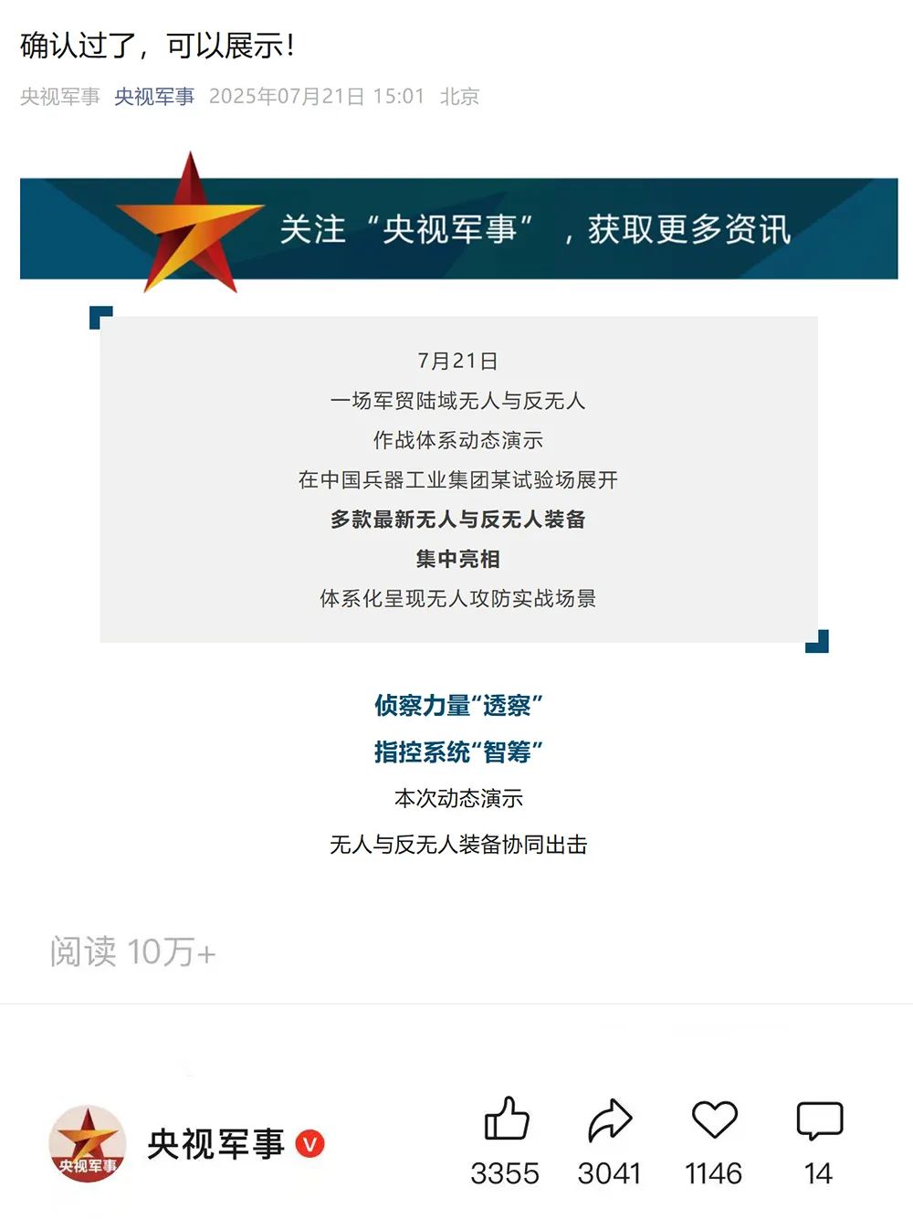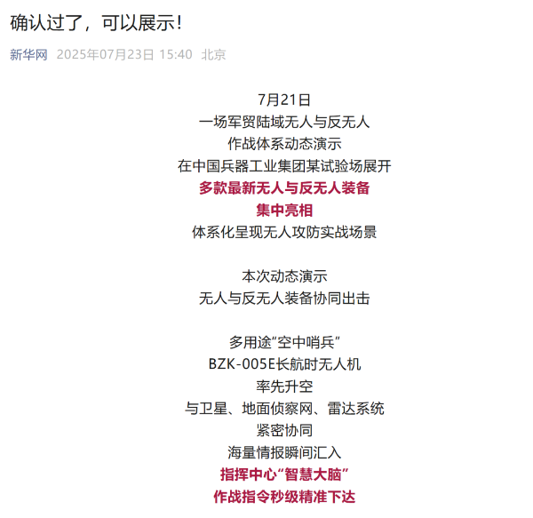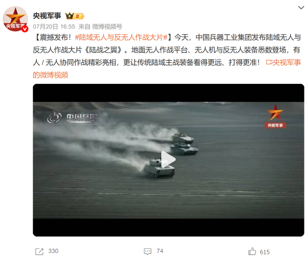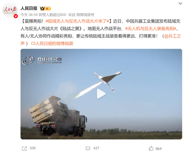 7月21日,中國(guó)兵器工業(yè)集團(tuán)有限公司在位于內(nèi)蒙古的某試驗(yàn)場(chǎng)舉辦軍貿(mào)陸域無(wú)人與反無(wú)人作戰(zhàn)體系主題日活動(dòng),攜無(wú)人機(jī)、巡飛彈、反無(wú)人機(jī)等最新武器裝備登場(chǎng)亮相,展現(xiàn)了一場(chǎng)無(wú)人與反無(wú)人領(lǐng)域激烈對(duì)抗的實(shí)戰(zhàn)場(chǎng)景。中央主流媒體、地方媒體、知名網(wǎng)絡(luò)媒體,以及集團(tuán)公司各宣傳平臺(tái)紛紛進(jìn)行報(bào)道,多次登上熱搜,引發(fā)廣泛關(guān)注。 央視新聞?lì)l道《新聞直播間》《東方時(shí)空》《24小時(shí)》、國(guó)防軍事頻道《正午國(guó)防軍事》《軍事報(bào)道》《國(guó)防軍事早報(bào)》、中文國(guó)際頻道《今日環(huán)球》、央視軍事新媒體等報(bào)道了集團(tuán)公司軍貿(mào)陸域無(wú)人與反無(wú)人作戰(zhàn)體系首次公開(kāi)實(shí)裝動(dòng)態(tài)演示有關(guān)情況,重點(diǎn)介紹了無(wú)人與反無(wú)人作戰(zhàn)最新裝備。 央視新聞?lì)l道《新聞直播間》:內(nèi)蒙古 軍貿(mào)陸域無(wú)人與反無(wú)人作戰(zhàn)最新裝備亮相 央視新聞?lì)l道《新聞直播間》:內(nèi)蒙古 軍貿(mào)陸域無(wú)人與反無(wú)人作戰(zhàn)最新裝備亮相 記者探訪無(wú)人裝備展區(qū) 央視新聞?lì)l道《新聞直播間》:軍貿(mào)陸域無(wú)人與反無(wú)人作戰(zhàn)最新裝備亮相·記者探訪 最強(qiáng)“盾牌” 反無(wú)人機(jī)系統(tǒng)新升級(jí) 人民日?qǐng)?bào)微博、央視軍事微博、央視新聞客戶端、中國(guó)新聞網(wǎng)、中新社國(guó)是直通車(chē)抖音、環(huán)球網(wǎng)微博、環(huán)球時(shí)報(bào)(X平臺(tái)、英文版客戶端)、中國(guó)日?qǐng)?bào)網(wǎng)、央視軍事報(bào)道微博、中國(guó)軍號(hào)微博、中央廣播電視總臺(tái)“空天逐夢(mèng)”微信視頻號(hào)、共青團(tuán)中央B站、國(guó)資小新微博等中央主流媒體、國(guó)家部委的新媒體播發(fā)集團(tuán)公司陸域無(wú)人與反無(wú)人作戰(zhàn)大片等視頻作品。 人民日?qǐng)?bào)微博 央視軍事微博 人民日?qǐng)?bào)、新華網(wǎng)、央視軍事、央視新聞、中央廣播電視總臺(tái)中國(guó)之聲、中國(guó)新聞網(wǎng)、中國(guó)日?qǐng)?bào)網(wǎng)、中國(guó)日?qǐng)?bào)英文報(bào)刊《CHINA DAILY》、《科技日?qǐng)?bào)》、光明日?qǐng)?bào)客戶端、環(huán)球網(wǎng)、環(huán)球時(shí)報(bào)、人民日?qǐng)?bào)海外版-海外網(wǎng)、央視網(wǎng)、小央視頻、參考消息、瞭望東方周刊、共青團(tuán)中央、國(guó)資小新新媒體、新浪網(wǎng)、騰訊網(wǎng)、搜狐網(wǎng)、鳳凰網(wǎng)、網(wǎng)易網(wǎng)等中央主流媒體、國(guó)家部委的新媒體及知名網(wǎng)絡(luò)媒體對(duì)集團(tuán)公司軍貿(mào)陸域無(wú)人與反無(wú)人作戰(zhàn)體系主題日活動(dòng)進(jìn)行了圖文、音頻、視頻報(bào)道。 央視軍事微信 人民日?qǐng)?bào)微信 新華網(wǎng)微信 來(lái)源/各主流媒體 |